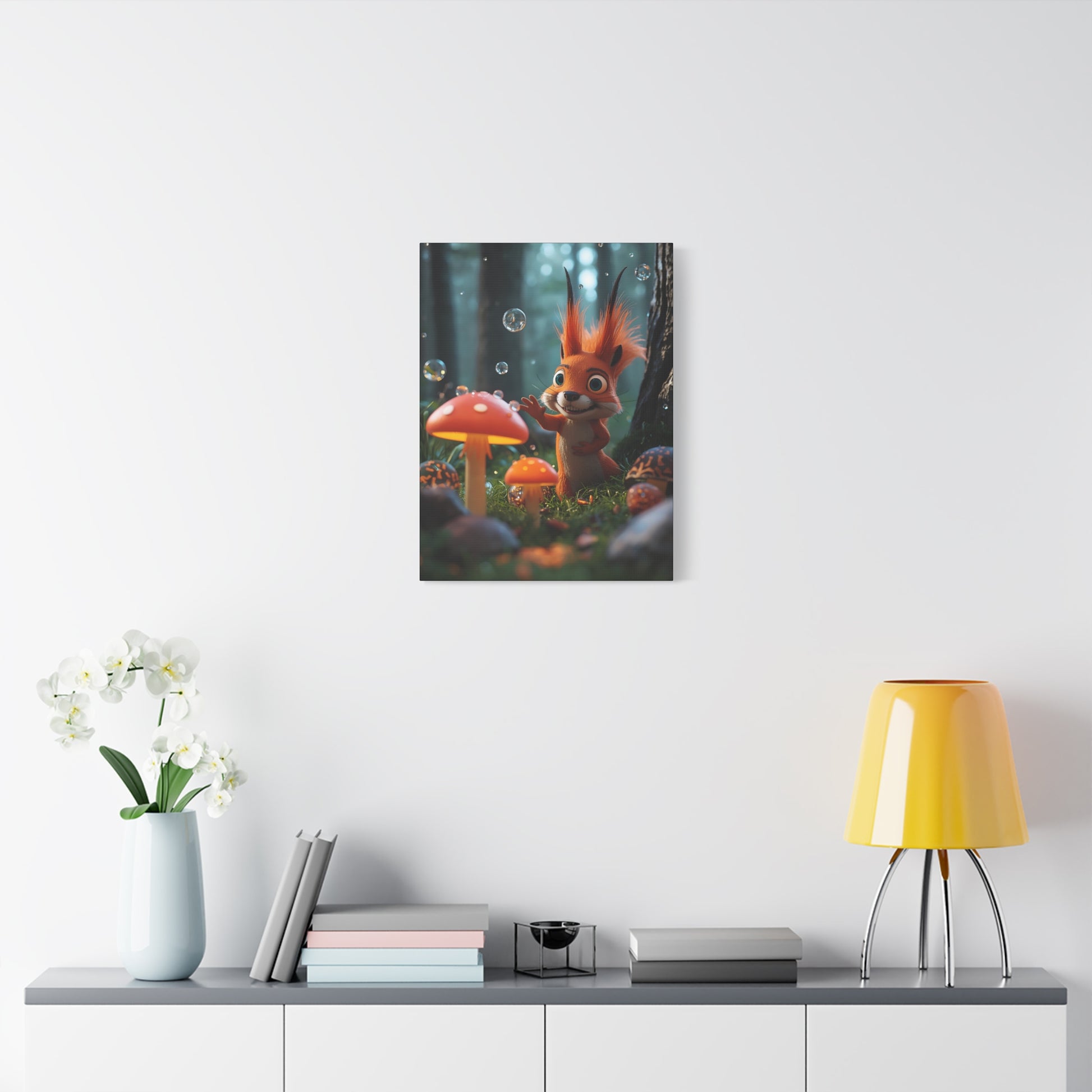 Niedliches Eichhörnchen & Pilz-Leinwandbild – Verspielte Wald-Wandkunst fürs Kinderzimmer