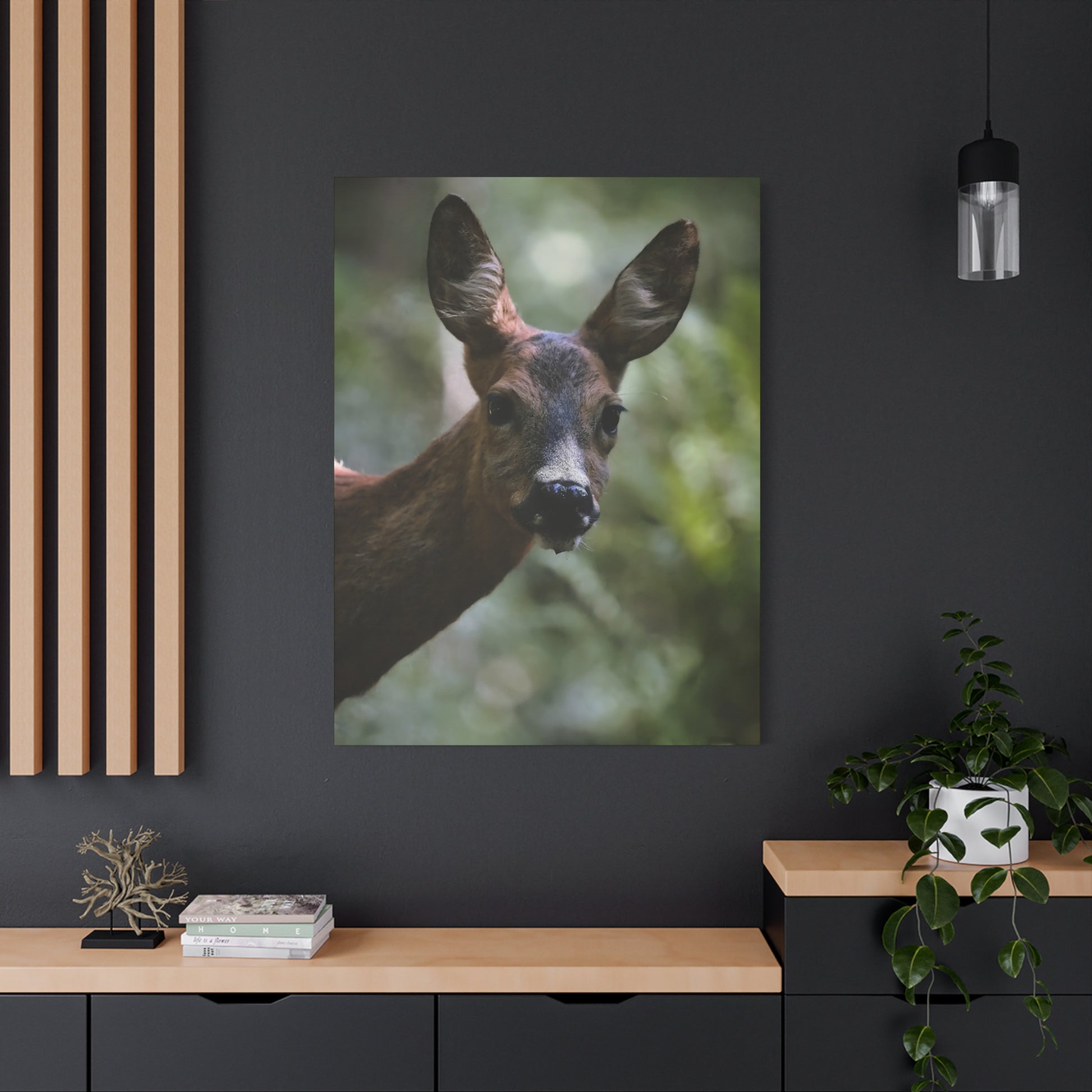 A matte stretched canvas that brings a quiet woodland moment into your home. Printed with UL-certified Greenguard Gold latex inks, the image keeps rich, natural tones while staying non-toxic and durable. The deep 1.25" profile and neat pine inner frame give the piece presence on any wall, while soft rubber dots and included back hanging hardware make installation simple and secure. The subtle texture of the cotton-poly canvas adds depth to the deer portrait, creating a contemplative focal point for living rooms, cabins, or entryways.
