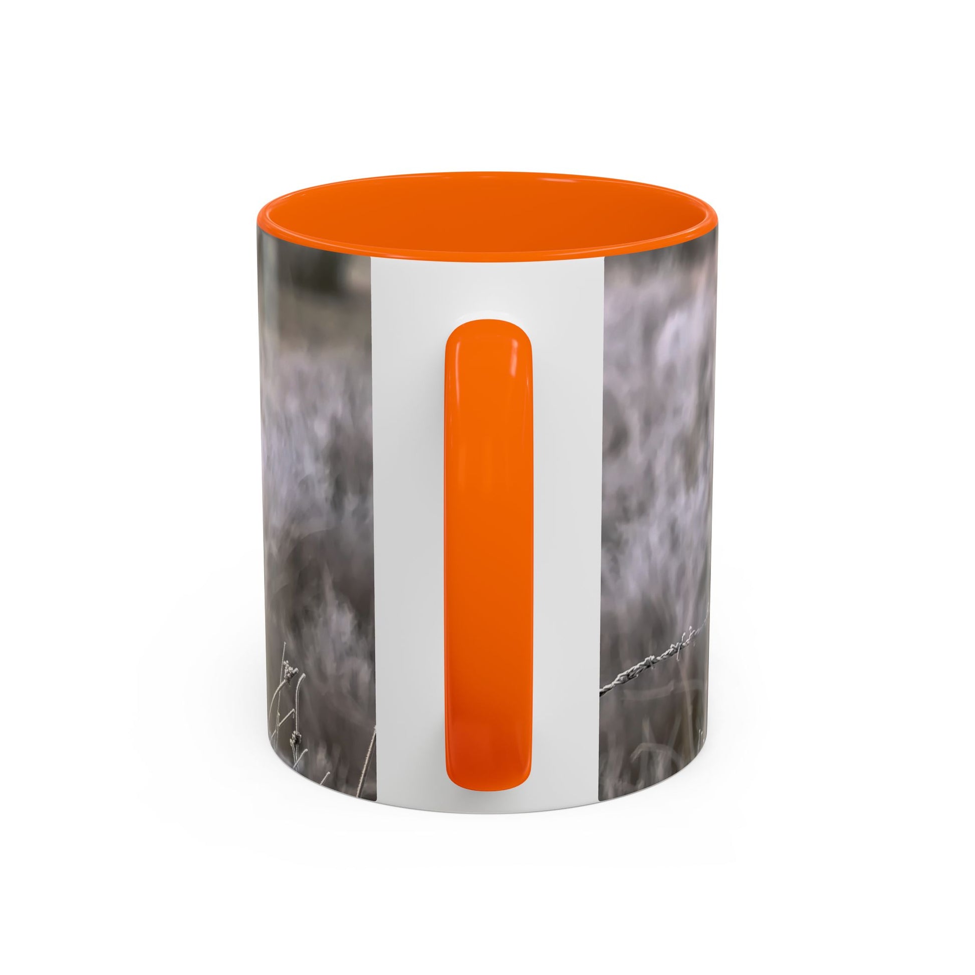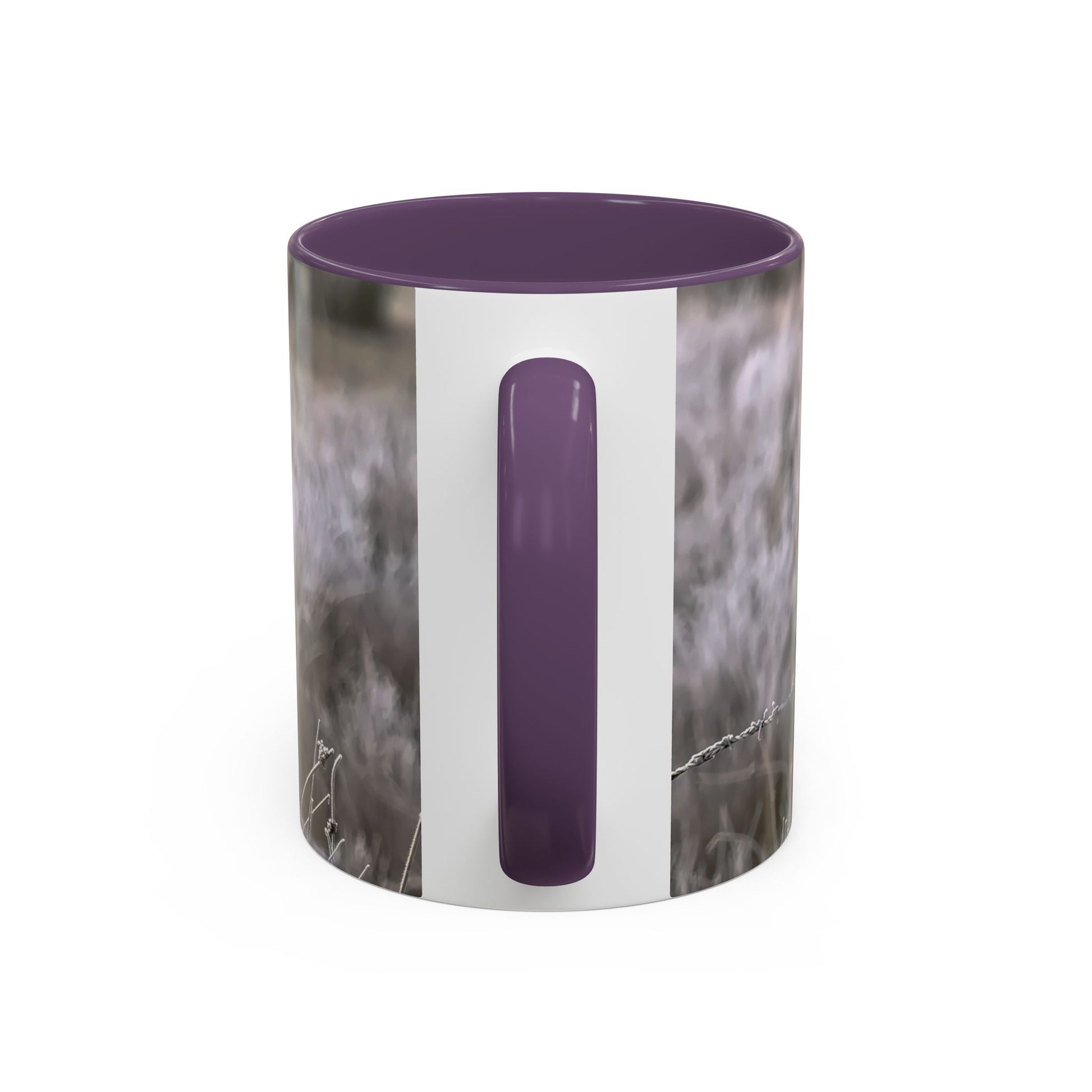 in a winter landscape. The muted palette and gentle depth-of-field create a calm, contemplative mood that slips easily into slow routines: the first sip at dawn, a mid-afternoon pause, or a window-seat moment watching weather move across fields. The colored interior and handle add a subtle contrast that frames the image without shouting, while the glossy finish keeps the scene luminous. For people who notice small things — birdwatchers, nature photographers, and anyone who keeps a memory of mornings close — this mug turns a daily ritual into a quiet ceremony.