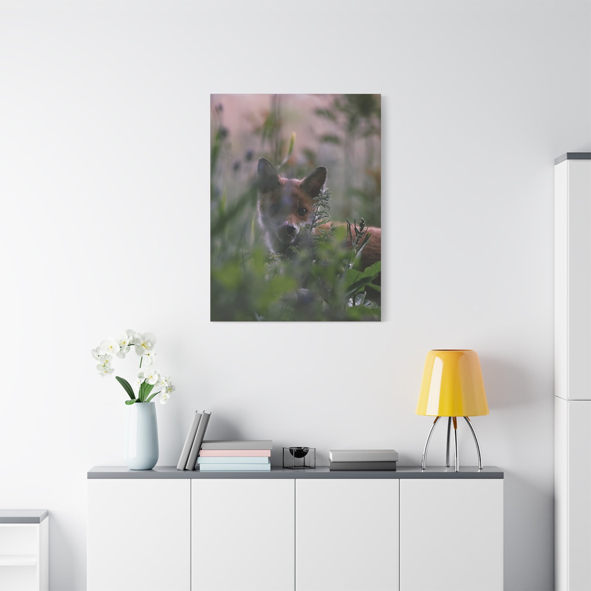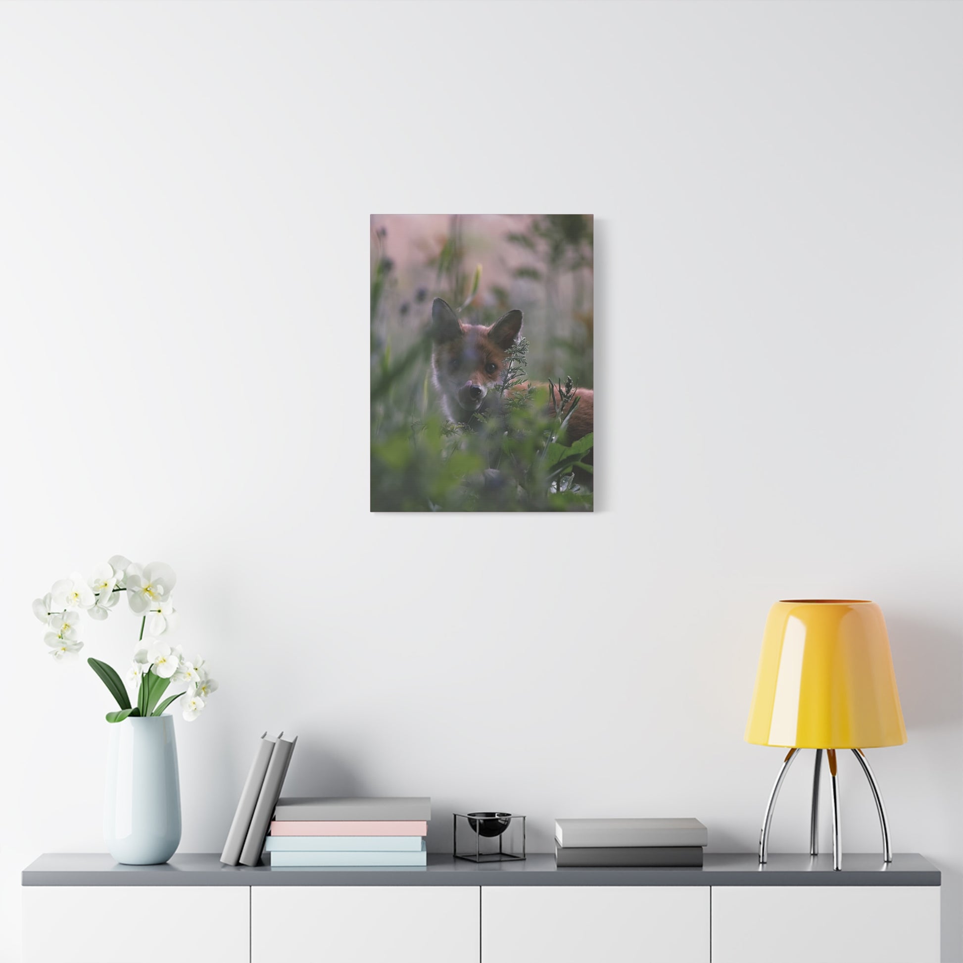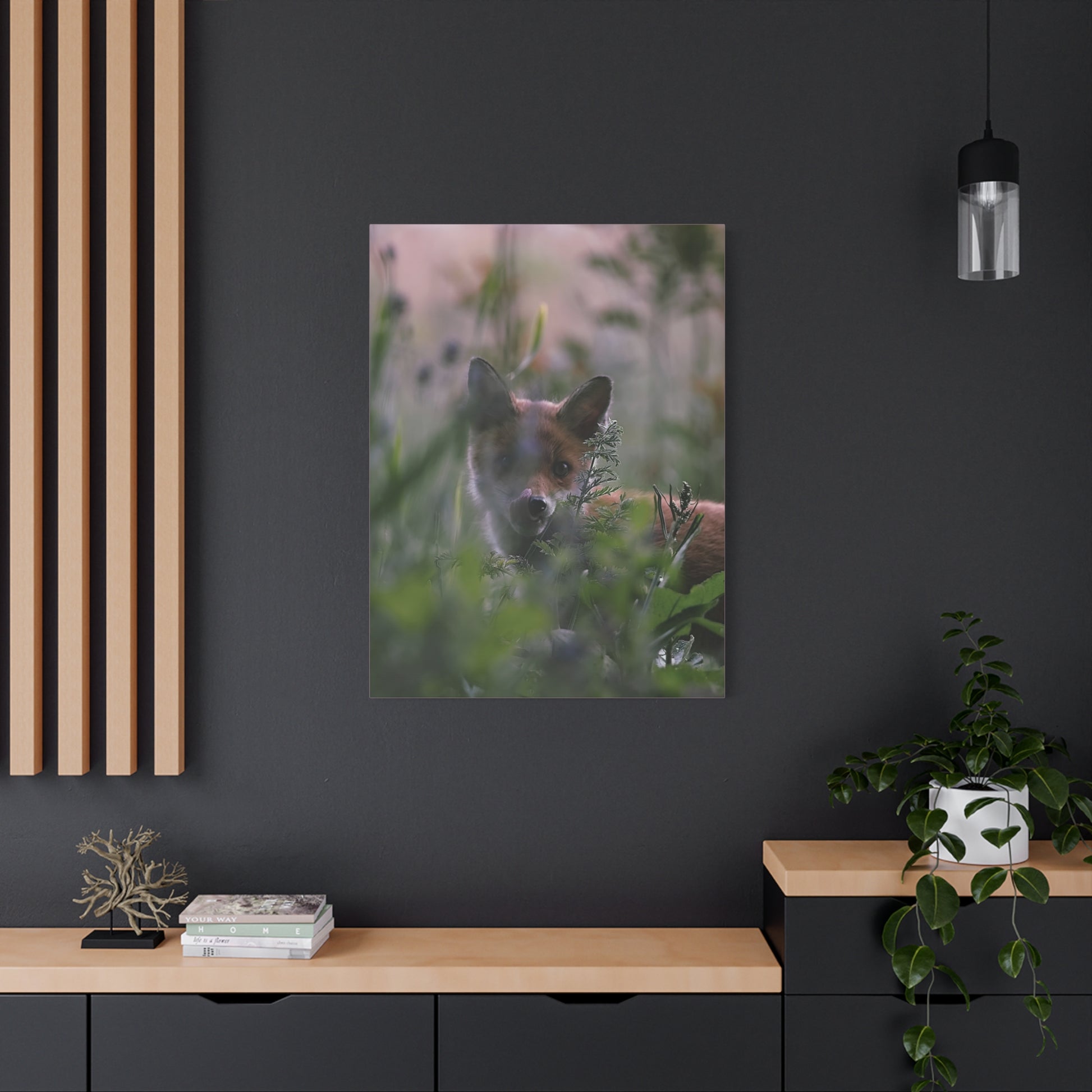 Zacht avondlicht filtert door het hoge weidegras. Een vos gluurt tussen de bladeren door – nieuwsgierig, voorzichtig, levendig – vastgelegd in gedempte groentinten en warme kastanjebruine kleuren op een fijn gestructureerd, mat canvas. Gespannen op een slank grenen frame van 3,17 cm, brengt deze print een rustig bosmoment in uw kamer zonder hinderlijke reflecties, waardoor subtiele details en een schilderachtig bokeh-effect de aandacht trekken. De print is eenvoudig op te hangen met de meegeleverde ophanghaken en blijft stevig staan dankzij discrete rubberen voetjes. Plaats hem in een leeshoek, hal of aan de muur van een blokhut om een kalme, wilde hartslag in uw dagelijks leven te brengen.