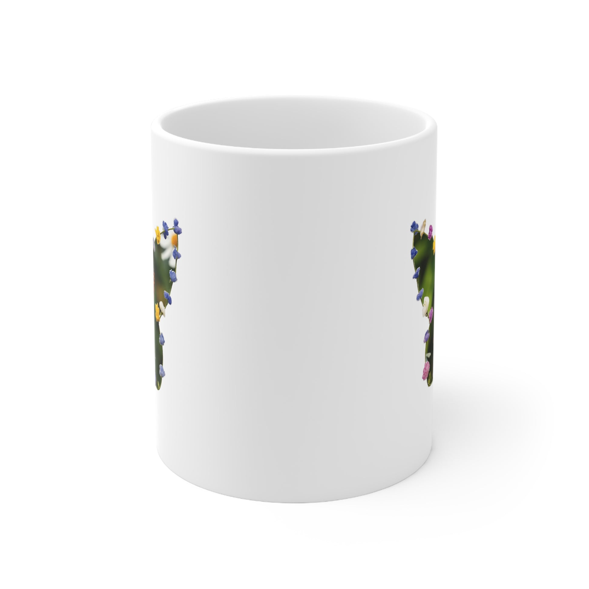Warm mornings with a quiet garden breeze. This white ceramic mug carries a delicate butterfly silhouette made of lush green leaves and tiny wildflowers, with a golden-speckled butterfly resting at its center. It’s the kind of cup that slows you down — tea steaming, hands around the C-shaped handle, and a small moment of calm before the day begins. The glossy finish makes the colors sing, and the sturdy ceramic feels familiar and comforting in hand. Choose 325ml for a cozy single-cup ritual or 440ml when you want a little extra comfort.