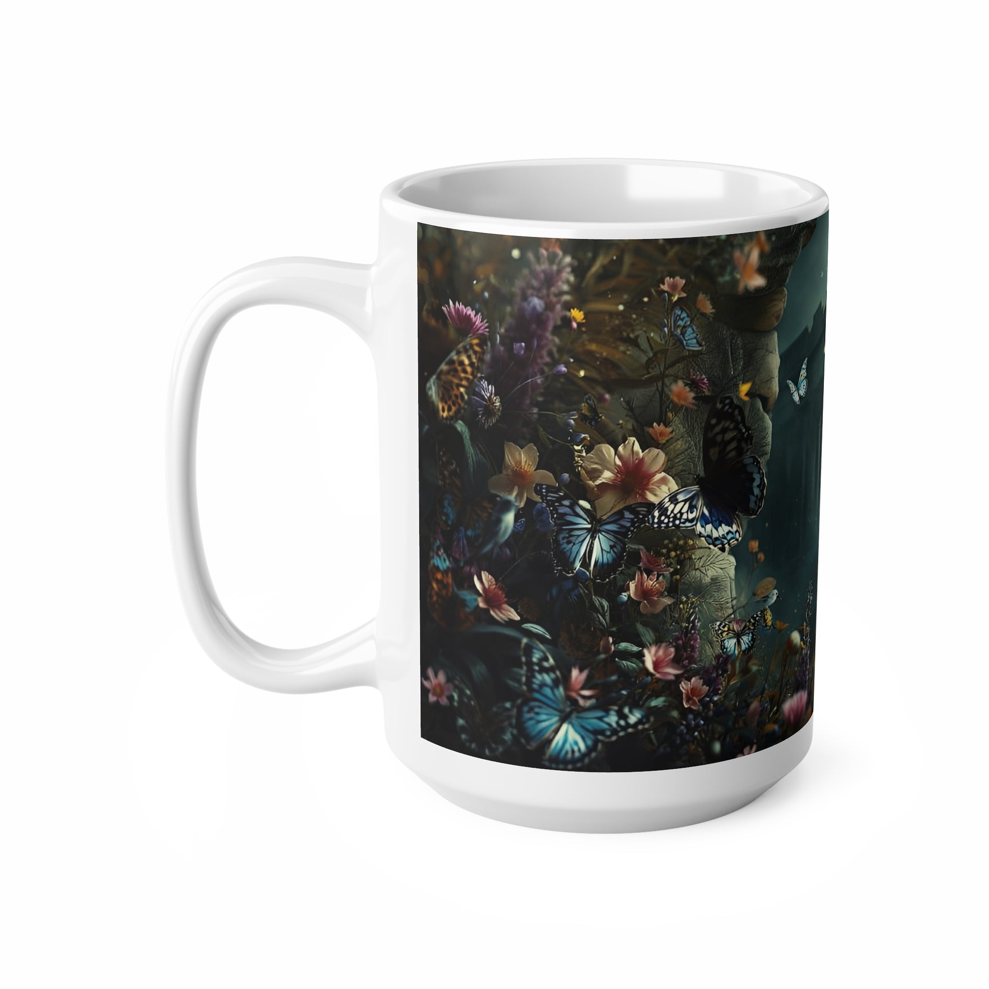 Sip slowly and let this ceramic mug carry you into a hushed, otherworldly morning. The wraparound print blends crumbling classical ruins with a lush, moonlit garden, a dear and drifting butterflies — a quiet collision of history and wild beauty. Warm coffee feels like a ritual here; the glossy white ceramic and vivid ORCA print hold every moody detail so the scene stays rich from first light to last sip. Comfortable C-handle and two size options mean you can reach for a small pick-me-up or a long, slow brew during late-night writing sessions or reflective weekends. Durable enough for daily use — microwave and dishwasher safe, lead- and BPA-free — this mug settles into the routines of anyone who treasures stories, atmosphere, and a little mystery in their morning cup.