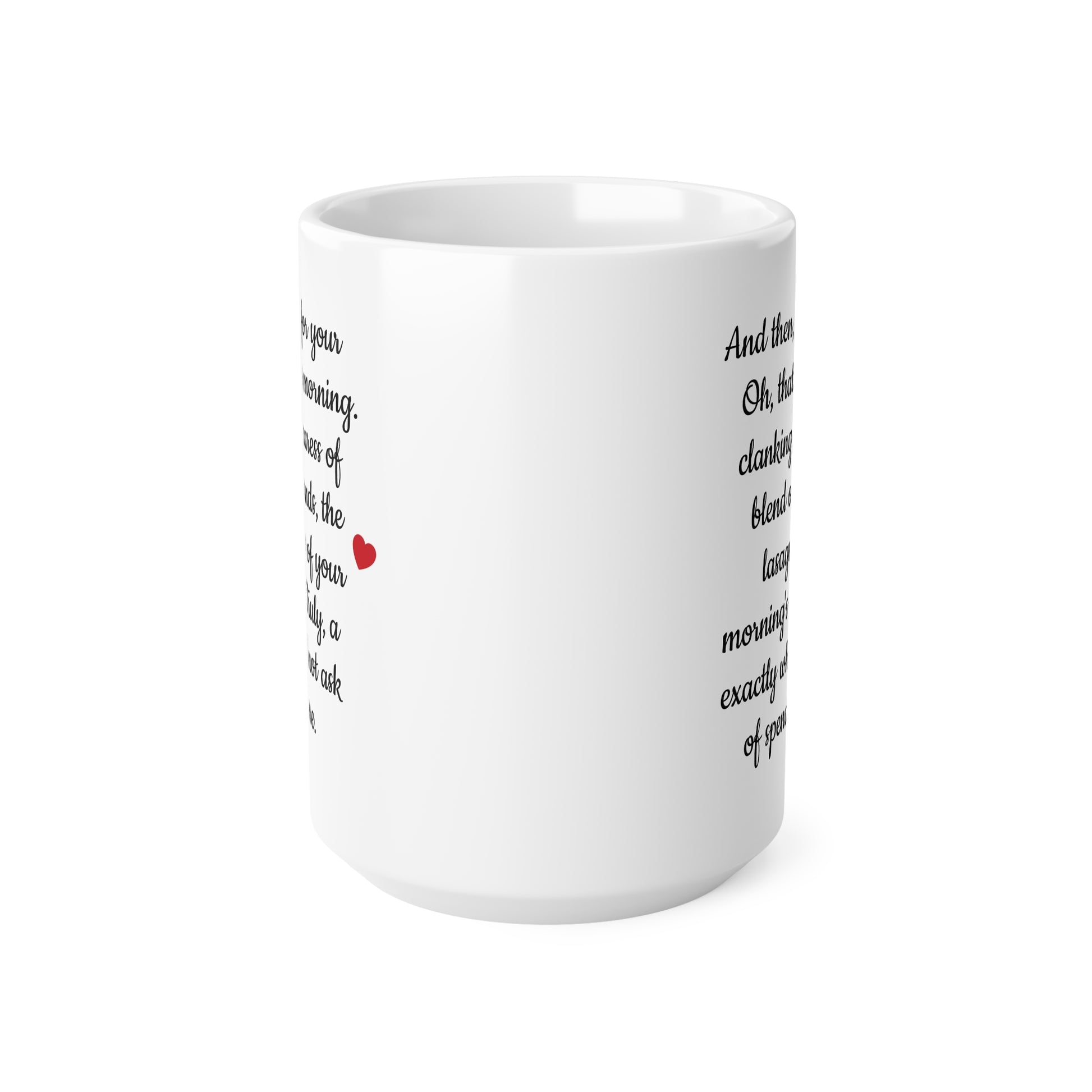 This ceramic coffee cup turns a quiet morning into a small, sincere ritual. Smooth white ceramic wraps a short, handwritten-style message that reads like a private note — warm, a little cheeky, and oddly intimate. Hold it in the C-shaped handle, feel the heat through the glossy finish, and read the lines as steam rises. It suits someone who savors slow mornings, smiling at simple comforts and the little personal moments that start the day. Use it on chilly mornings, weekend slow-brews, or during a late-night writing session when a small, familiar voice feels like company.