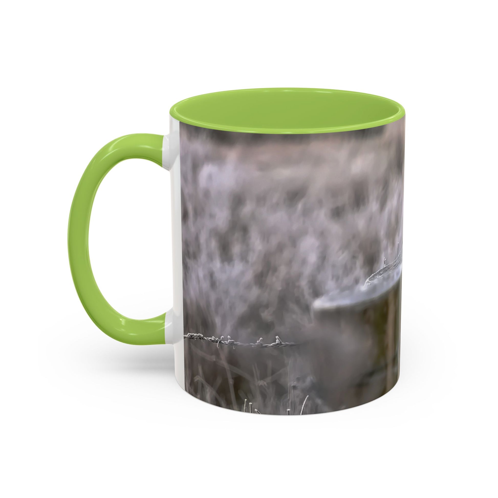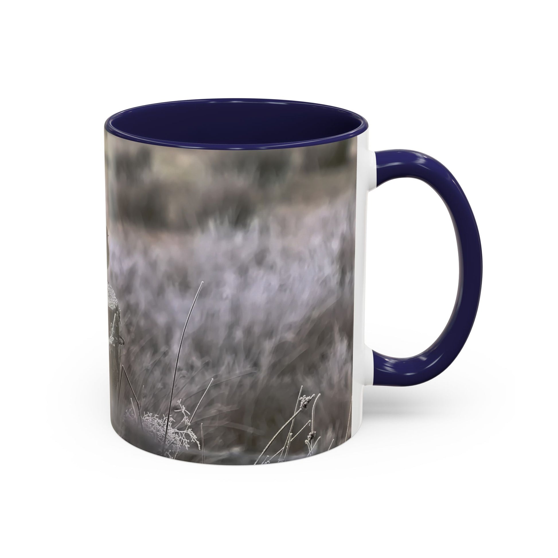 in a winter landscape. The muted palette and gentle depth-of-field create a calm, contemplative mood that slips easily into slow routines: the first sip at dawn, a mid-afternoon pause, or a window-seat moment watching weather move across fields. The colored interior and handle add a subtle contrast that frames the image without shouting, while the glossy finish keeps the scene luminous. For people who notice small things — birdwatchers, nature photographers, and anyone who keeps a memory of mornings close — this mug turns a daily ritual into a quiet ceremony.
