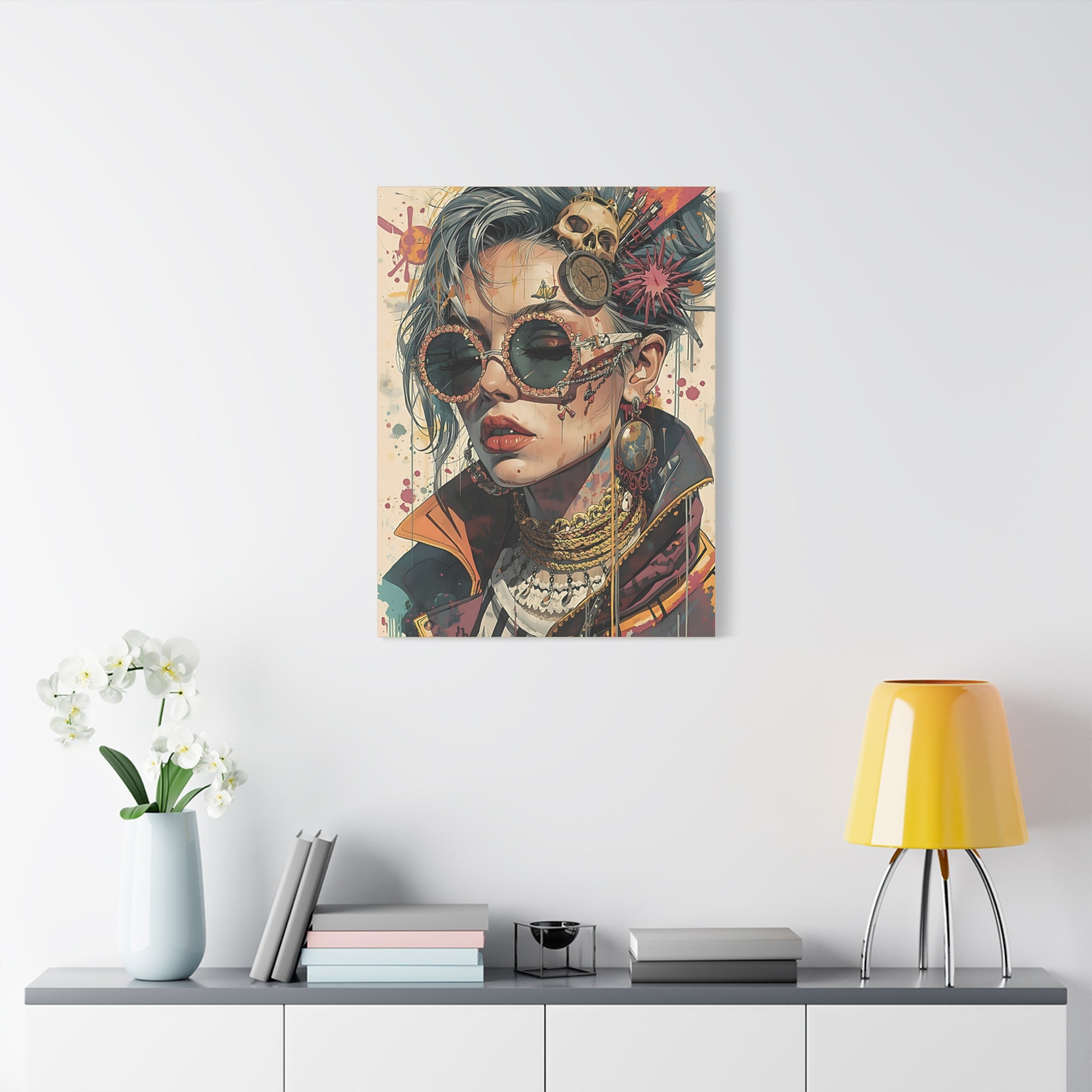 This matte stretched canvas brings an edgy, cinematic portrait into your space with painterly detail and rich, muted tones. The artwork captures a rebellious spirit—ornate sunglasses, layered jewelry, and a touch of surreal decay—rendered with fine texture that the matte finish highlights without glare. Hung over a workspace, gallery wall, or entryway, it sets a mood: urban grit softened by careful craft. The 1.25" profile gives the piece presence without overpowering the room, and the subtle rubber feet and included hanging hardware make installation clean and steady.